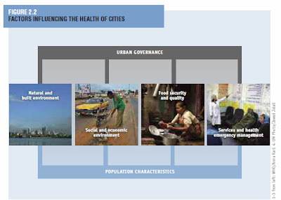 Hidden Cities: Unmasking and Overcoming Health Inequities in Urban Settings (2010), produced in collaboration with the World Health Organization, provides a good overview of the history and current situation in terms of cities and health. Topics cange across the natural and build environment, social and conomic issues, food secutiy, health services, and general urban governange http://www.unhabitat.org/pmss/listItemDetails.aspx?publicationID=3049